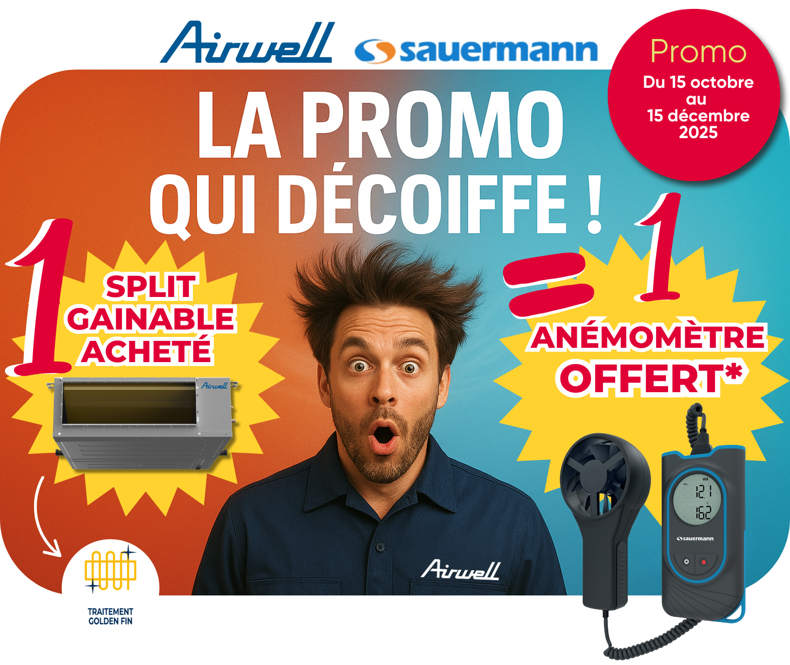 *Pour toute nouvelle commande enregistrée et facturée par Airwell du 15 octobre au 15 décembre 2025, obtenez 1 Thermo-anémomètre à hélice connecté (application iOS et Android gratuite)