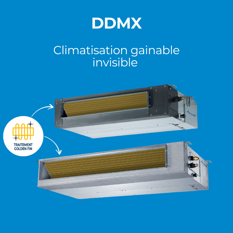Le système de climatisation réversible DDMX s’encastre en faux plafond pour disparaître complètement du champ de vision, tout en intégrant le traitement Golden Fin, qui protège durablement contre la corrosion et optimise les performances thermiques.